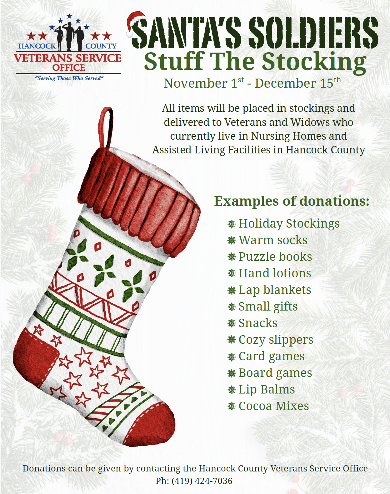 Stuff The Stocking November 1st - December 15th All items will be placed in stockings and delivered to Veterans and Widows who currently live in Nursing Homes and Assisted Living Facilities in Hancock County. Examples of donations: Holiday Stockings, Warm socks, Puzzle books, Hand lotions, Lap blankets Small gifts, Snacks, Cozy slippers, Card games, Board […]